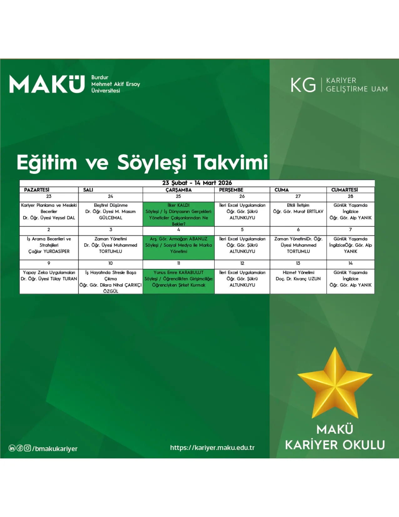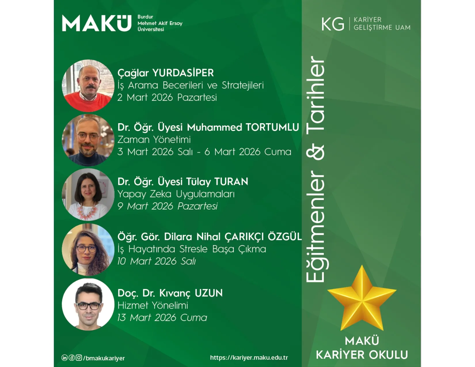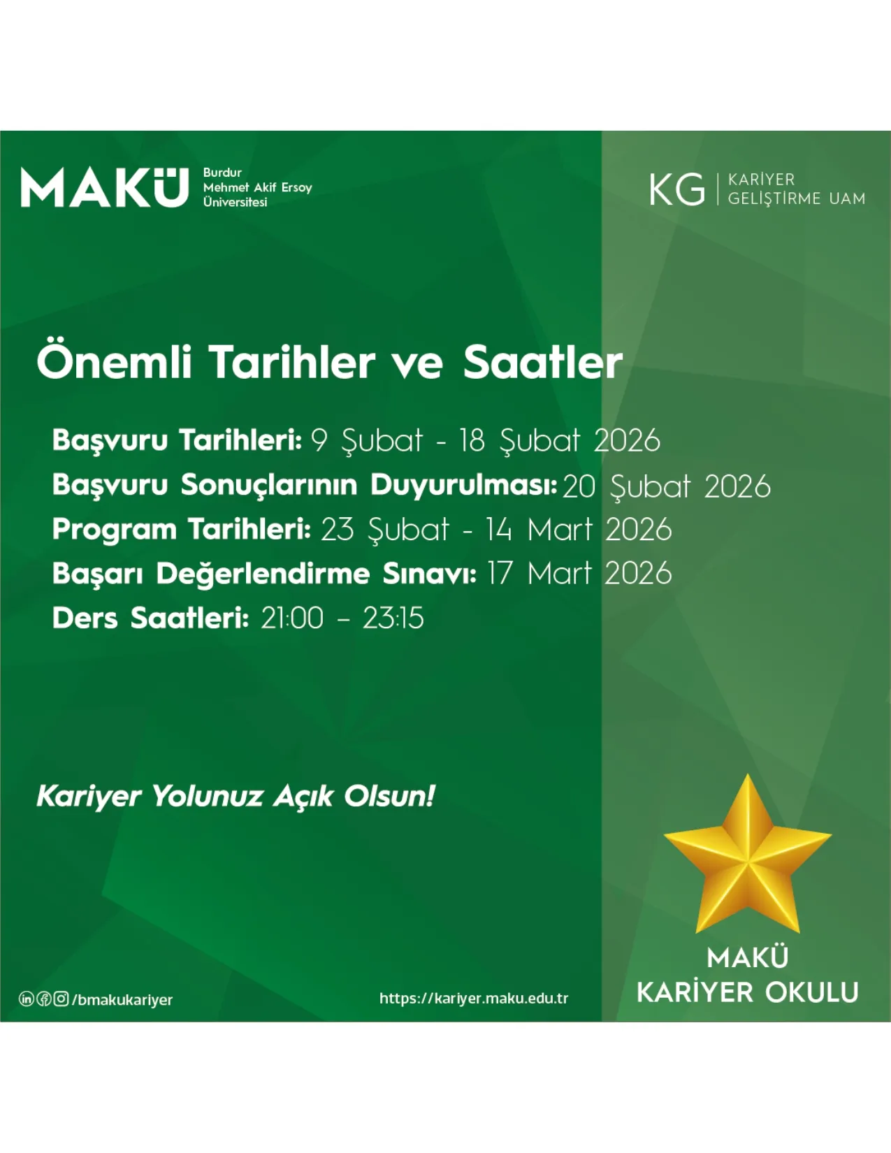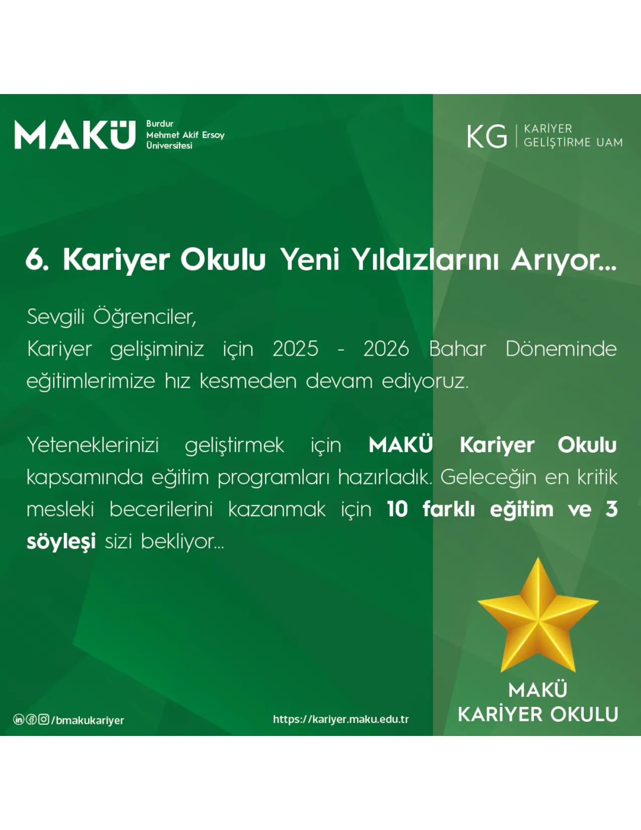 The Career School Program conducted by our University's Career Development Application and Research Center is a comprehensive development program aimed at increasing our students' career awareness during their university studies; equipping them with the professional and personal skills demanded by the business world to ensure they become more prepared individuals for the working life after graduation. Posters related to the program are attached.