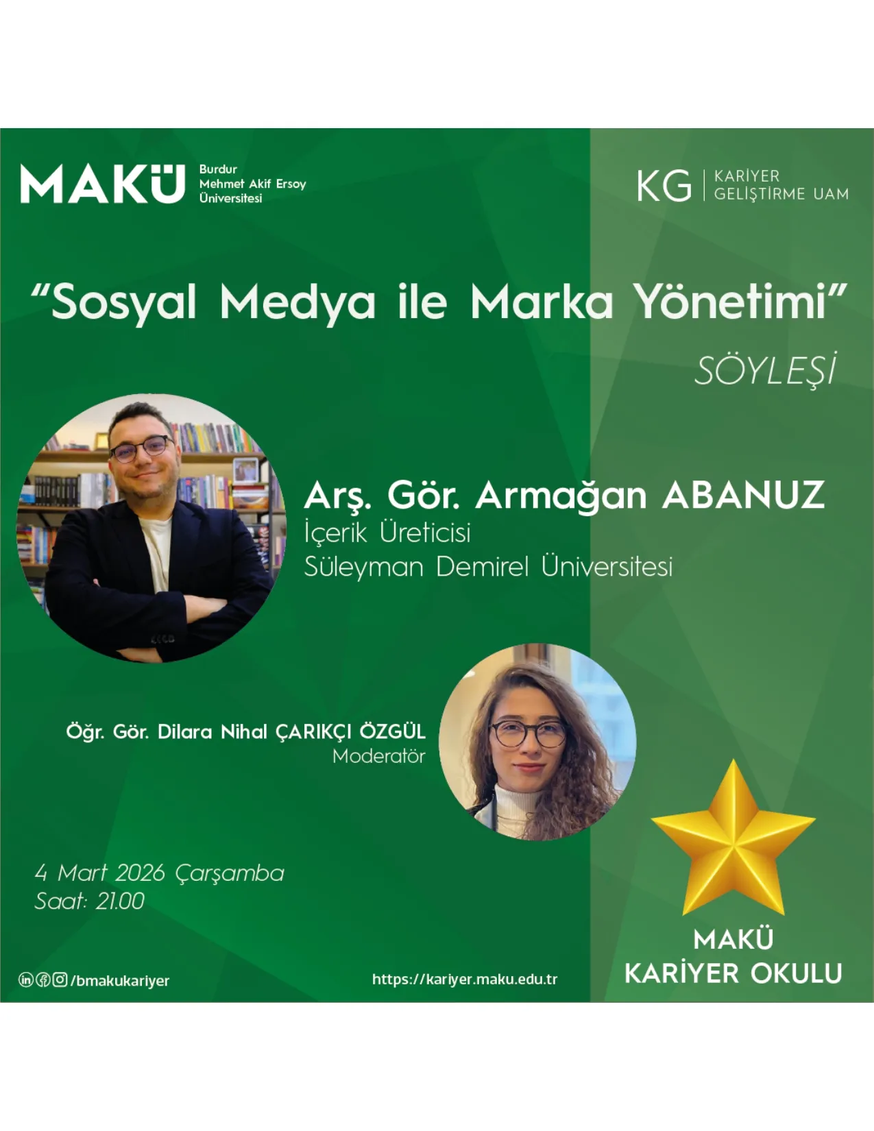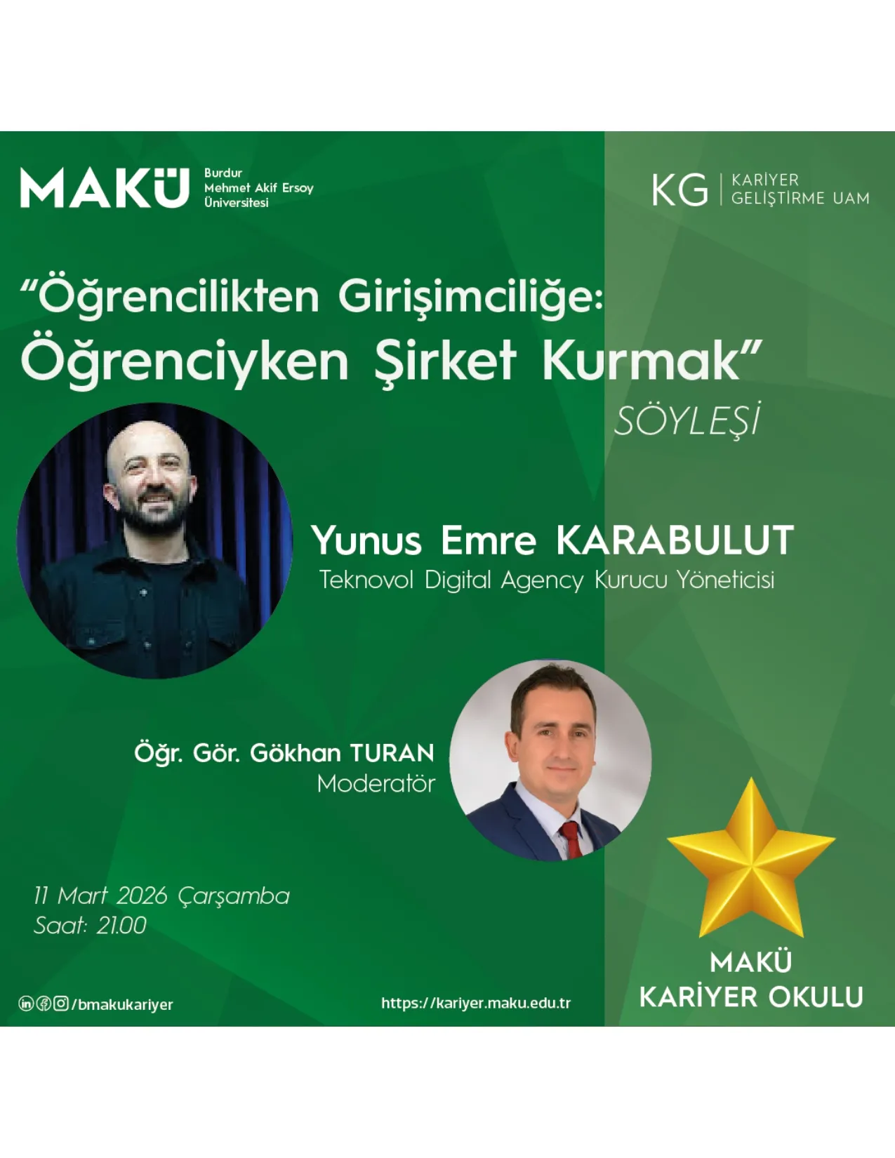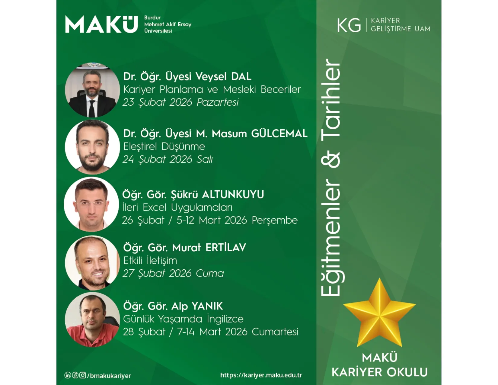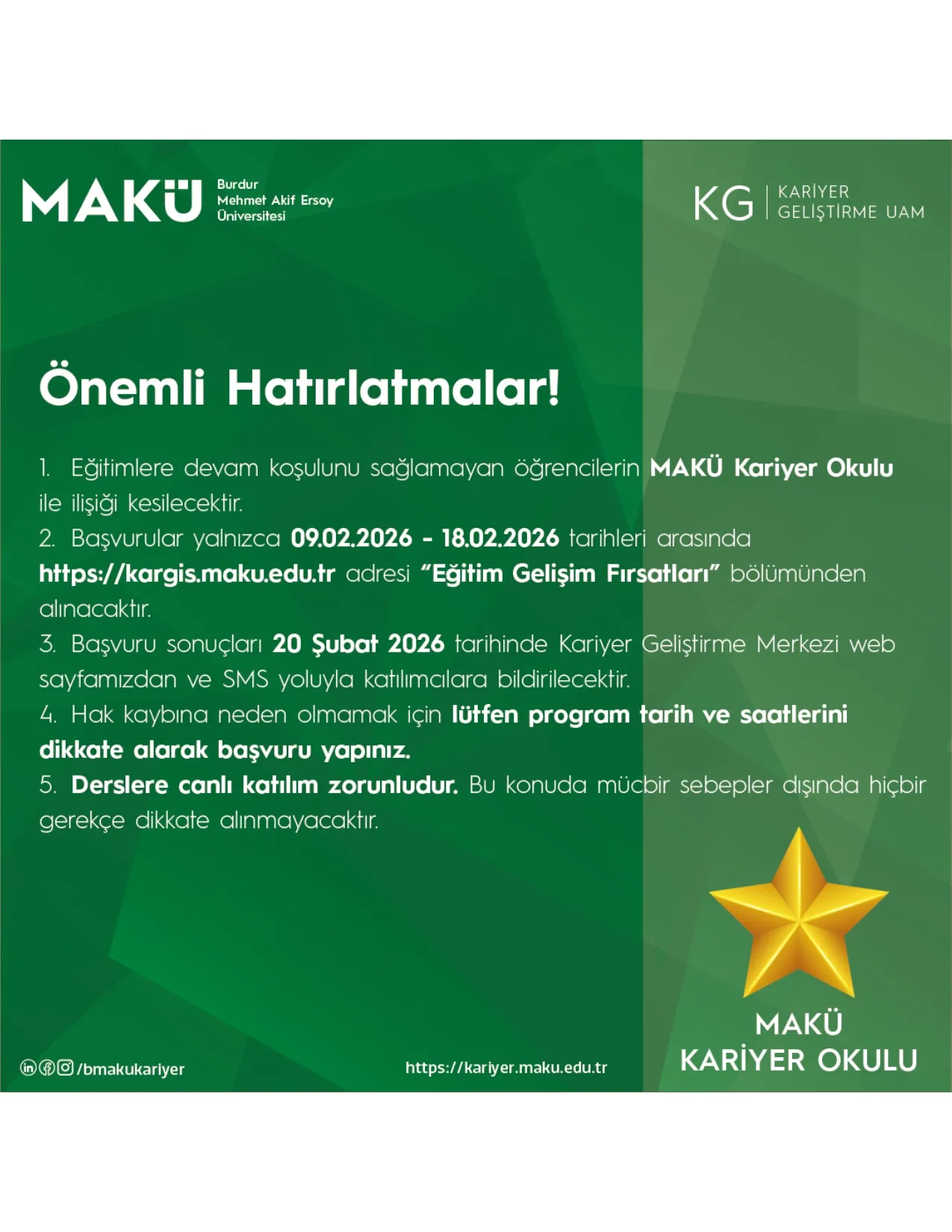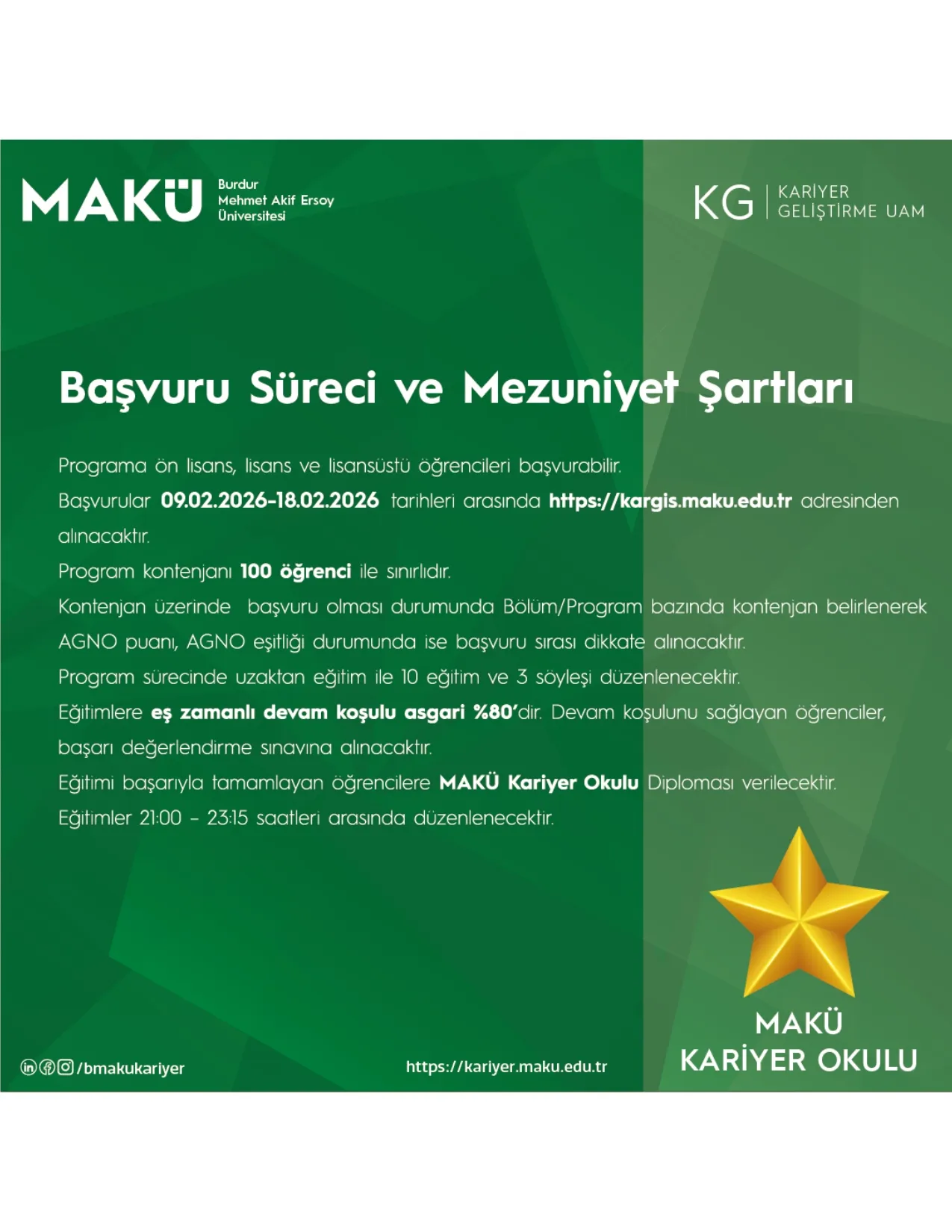 The Career School Program conducted by our University's Career Development Application and Research Center is a comprehensive development program aimed at increasing our students' career awareness during their university studies; equipping them with the professional and personal skills demanded by the business world to ensure they become more prepared individuals for the working life after graduation. Posters related to the program are attached.